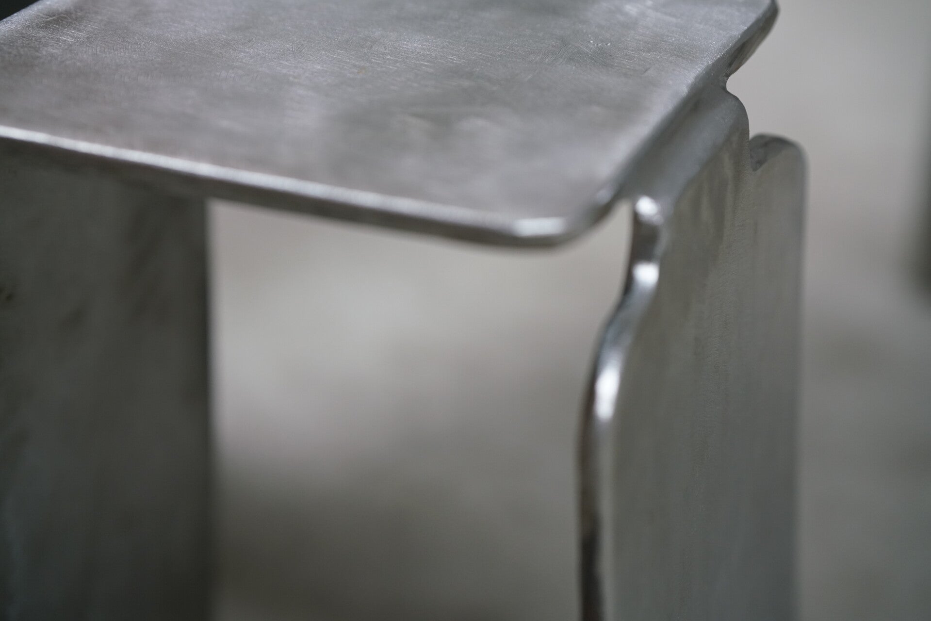 Brushed steel surfaces and a raw industrial aesthetic define each piece, highlighting the quiet beauty of the material. Rooted in brutalism, the design seeks a strong connection between industrial processes and manual craftsmanship.